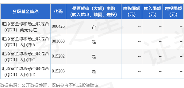 注:1、本基金汇添富全球移动互联混合(QDII)人民币A暂停申购、定期定额投资业务期间,其他业务仍照常办理。本基金汇添富全球移动互联混合(QDII)人民币A恢复申购、定期定额投资业务的具体时间将另行公告。