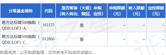 证券之星消息,12月26日易方达基金管理有限公司发布《易方达标普500指数证券投资基金(LOF)暂停申购及定期定额投资业务的公告》。公告中提示,为了基金的平稳运作,自2024年12月26日起易方达标普500指数证券投资基金(LOF)暂停申购及定期定额投资业务,下属分级基金调整明细如下: