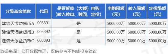 证券之星消息,12月27日建信基金管理有限责任公司发布《建信天添益货币市场基金在中国建设银行销售渠道暂停大额申购、大额转换转入、定期定额投资公告》。公告中提示,为满足投资者需求,自2024年12月30日起建信天添益货币市场基金在中国建设银行销售渠道暂停大额申购、大额转换转入、定期定额投资,申购、转换转入上限金额为5000.0万元,下属分级基金调整明细如下: