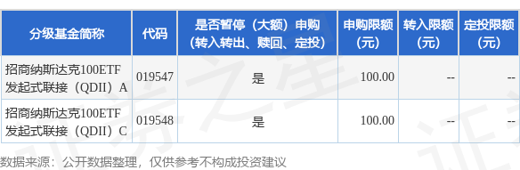 证券之星消息,12月30日招商基金管理有限公司发布《关于调整招商纳斯达克100交易型开放式指数证券投资基金发起式联接基金(QDII)大额申购(含定期定额投资)业务的公告》。公告中提示,为保障基金的平稳运作,维护基金份额持有人利益,自2024年12月30日起调整招商纳斯达克100交易型开放式指数证券投资基金发起式联接基金(QDII)大额申购(含定期定额投资)业务,申购上限金额为0.01万元,下属分级基金调整明细如下: