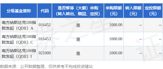 证券之星消息,1月2日南方基金管理股份有限公司发布《关于调整南方纳斯达克100指数发起式证券投资基金(QDII)申购和定投业务金额限制的公告》。公告中提示,为保护基金份额持有人的利益,自2025年1月2日起调整南方纳斯达克100指数发起式证券投资基金(QDII)申购和定投业务金额限制,申购上限金额为0.1万元,下属分级基金调整明细如下: