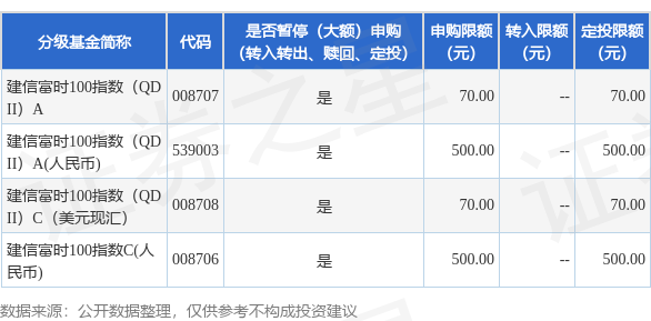 证券之星消息,1月6日建信基金管理有限责任公司发布《建信富时100指数型证券投资基金(QDII)基金暂停大额申购、定期定额投资公告》。公告中提示,为保护投资者利益,自2025年1月7日起建信富时100指数型证券投资基金(QDII)基金暂停大额申购、定期定额投资,下属分级基金调整明细如下: