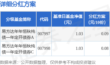 证券之星消息,1月7日发布《易方达年年恒秋纯债一年定期开放债券型发起式证券投资基金分红公告》。本次分红为2024年度的第4次分红。公告显示,本次分红的收益分配基准日为12月12日,详细分红方案如下: