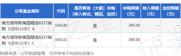 证券之星消息,1月8日南方基金管理股份有限公司发布《关于调整南方道琼斯美国精选REIT指数证券投资基金(QDII-LOF)申购和定投业务金额限制的公告》。公告中提示,为保护基金份额持有人的利益,自2025年1月8日起调整南方道琼斯美国精选REIT指数证券投资基金(QDII-LOF)申购和定投业务金额限制,申购上限金额为0.03万元,下属分级基金调整明细如下: