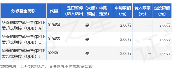 证券之星消息,1月9日华泰柏瑞基金管理有限公司发布《华泰柏瑞中证韩交所中韩半导体交易型开放式指数证券投资基金发起式联接基金(QDII)调整大额申购(含定期定额投资)业务的公告》。公告中提示,为保证本基金的稳定运作,保护基金份额持有人利益,以及根据《华泰柏瑞中证韩交所中韩半导体交易型开放式指数证券投资基金发起式联接基金(QDII)基金合同》的相关规定,自2025年1月9日起华泰柏瑞中证韩交所中韩半导体交易型开放式指数证券投资基金发起式联接基金(QDII)调整大额申购(含定期定额投资)业务,申购上限金额为2.0万元,下属分级基金调整明细如下: