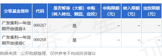 证券之星消息,1月9日广发基金管理有限公司发布《关于广发集利一年定期开放债券型证券投资基金暂停机构投资者大额申购(含转换转入)业务的公告》。公告中提示,为保护基金份额持有人利益,自2025年1月9日起广发集利一年定期开放债券型证券投资基金暂停机构投资者大额申购(含转换转入)业务,申购、转换转入上限金额为10.0万元,下属分级基金调整明细如下: