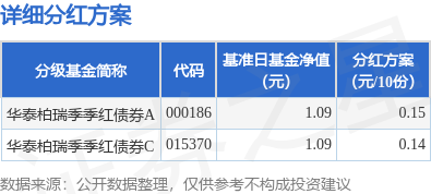 证券之星消息,1月9日发布《华泰柏瑞季季红债券型证券投资基金分红公告》。2024年度第四次分红。公告显示,本次分红的收益分配基准日为12月12日,详细分红方案如下: