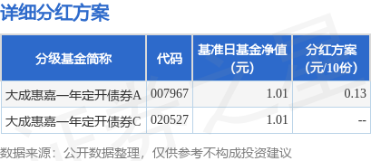 证券之星消息,1月10日发布《大成基金管理有限公司关于大成惠嘉一年定期开放债券型证券投资基金2024年度第2次分红的公告》。本次分红为2024年度的第2次分红。公告显示,本次分红的收益分配基准日为12月12日,详细分红方案如下: