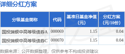 证券之星消息,1月10日发布《国投瑞银中高等级债券型证券投资基金分红公告》。2025年第1次分红。公告显示,本次分红的收益分配基准日为12月12日,详细分红方案如下: