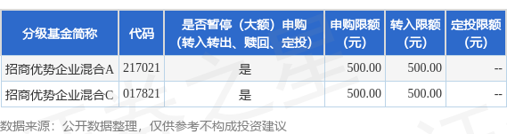 证券之星消息,1月10日招商基金管理有限公司发布《关于调整招商优势企业混合型证券投资基金大额申购(含定期定额投资)和转换转入业务的公告》。公告中提示,为保障基金的平稳运作,维护基金份额持有人利益,自2025年1月15日起调整招商优势企业混合型证券投资基金大额申购(含定期定额投资)和转换转入业务,申购、转换转入上限金额为0.05万元,下属分级基金调整明细如下: