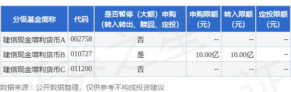 证券之星消息,1月10日建信基金管理有限责任公司发布《建信现金增利货币市场基金B类基金份额在中国建设银行销售渠道暂停大额申购、大额转换转入、定期定额投资公告》。公告中提示,为保护投资者利益,自2025年1月13日起建信现金增利货币市场基金B类基金份额在中国建设银行销售渠道暂停大额申购、大额转换转入、定期定额投资,申购、转换转入上限金额为10.0亿元,下属分级基金调整明细如下: