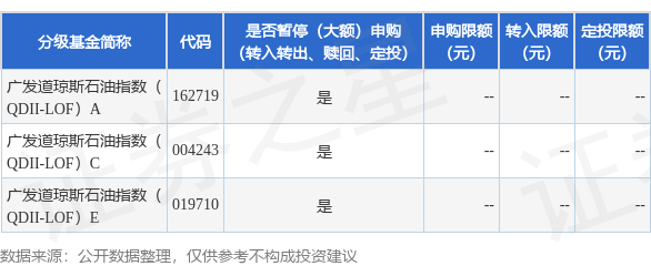 证券之星消息,1月16日广发基金管理有限公司发布《关于广发道琼斯美国石油开发与生产指数证券投资基金(QDII-LOF)暂停申购(含转换转入、定期定额和不定额投资)及赎回(含转换转出)业务的公告》。公告中提示,为美国证券交易所非交易日,自2025年1月20日起广发道琼斯美国石油开发与生产指数证券投资基金(QDII-LOF)暂停申购(含转换转入、定期定额和不定额投资)及赎回(含转换转出)业务,下属分级基金调整明细如下: