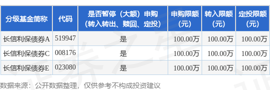 证券之星消息,1月17日长信基金管理有限责任公司发布《长信基金管理有限责任公司关于长信利保债券型证券投资基金暂停大额申购(含转换转入、定期定额投资)业务的公告》。公告中提示,为保护基金份额持有人的利益,根据《长信利保债券型证券投资基金基金合同》的有关规定,暂停长信利保债券100万元以上的大额申购(含转换转入、定期定额投资)业务,自2025年1月20日起长信基金管理有限责任公司关于长信利保债券型证券投资基金暂停大额申购(含转换转入、定期定额投资)业务,下属分级基金调整明细如下: