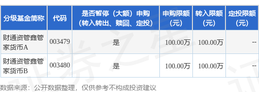 注:(1)根据法律法规和基金合同的相关规定,自2025年1月22日起,财通证券资产管理有限公司(以下简称“本公司”)将调整财通资管鑫管家货币市场基金(以下简称“本基金”)A类、B类份额在“玄元保险代理有限公司”的大额申购(含转换转入、定期定额投资)业务。届时起,若单日单个基金账户的单笔申购(含转换转入、定期定额投资)金额超过人民币100万元(不含)的,本公司将有权对超过100万元的部分予以拒绝。若单日单个基金账户多笔累计申购(含转换转入、定期定额投资)金额超过人民币100万元(不含),则对申请按照申请金额从大到小排序,逐笔累加至符合不超过人民币100万元(含)限额的申请确认成功,对超过100万元的部分及其余笔数本公司将有权予以拒绝。本基金A类、B类份额合并判断。