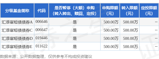 注:1、自2025年01月24日起(含2025年01月24日),汇添富短债债券A暂停大额申购、大额转换转入、大额定期定额投资业务,单日单个基金账户单笔或多笔累计申购、转换转入、定期定额投资的金额不应超过5000000人民币元(含5000000人民币元)。当单日某基金账户单笔或多笔累计申购、转换转入、定期定额投资该份额的金额超过5000000人民币元,本公司将部分或全部拒绝。该份额暂停上述大额业务期间,其他业务仍照常办理。自2025年02月05日起,本基金汇添富短债债券A将恢复办理大额申购、大额转换转入、大额定期定额投资业务,届时将不再另行公告。