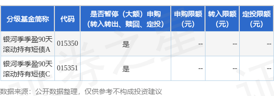 注:1)银河季季盈90天滚动持有短债债券型证券投资基金(以下简称“本基金”)暂停申购(含转换转入和定期定额投资)期间,本公司正常办理本基金的赎回和转换转出等业务。