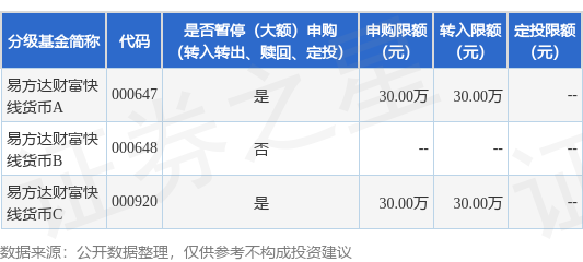 注:(1)根据法律法规和基金合同的相关规定,易方达基金管理有限公司(以下简称“本公司”)决定自2025年1月24日起调整易方达财富快线货币市场基金(以下简称“本基金”)A类基金份额、C类基金份额在全部非直销销售机构的大额申购、大额转换转入业务限制,具体调整为:单日单个基金账户在全部非直销销售机构(A类基金份额由京东肯特瑞销售的除外)累计申购(含定期定额投资及转换转入,下同)本基金A类基金份额或C类基金份额的金额不超过30万元(含)。如单日单个基金账户单笔申购本基金A类基金份额或C类基金份额的金额超过30万元(不含),则30万元确认申购成功,超过30万元(不含)金额的部分将确认失败;如单日单个基金账户多笔累计申购本基金A类基金份额的金额超过30万元(不含)或单日单个基金账户多笔累计申购本基金C类基金份额的金额超过30万元(不含),则对该类基金份额的申请按照申请金额从大到小排序,基金管理人将逐笔累加至该类基金份额不超过30万元(含)限额的申请确认成功,该类基金份额其余申请金额确认失败。