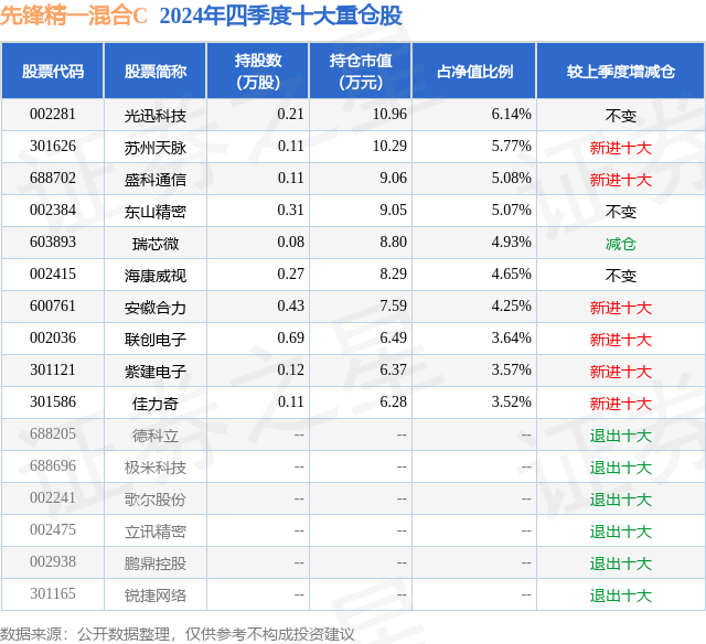 证券之星消息,日前先锋精一混合C基金公布四季报,2024年四季度最新规模0.01亿元,季度净值涨幅为9.73%。
