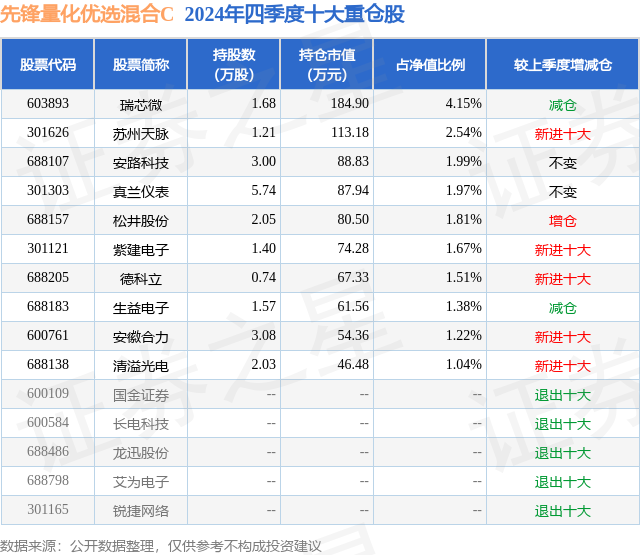 证券之星消息,日前先锋量化优选混合C基金公布四季报,2024年四季度最新规模0.03亿元,季度净值涨幅为6.67%。