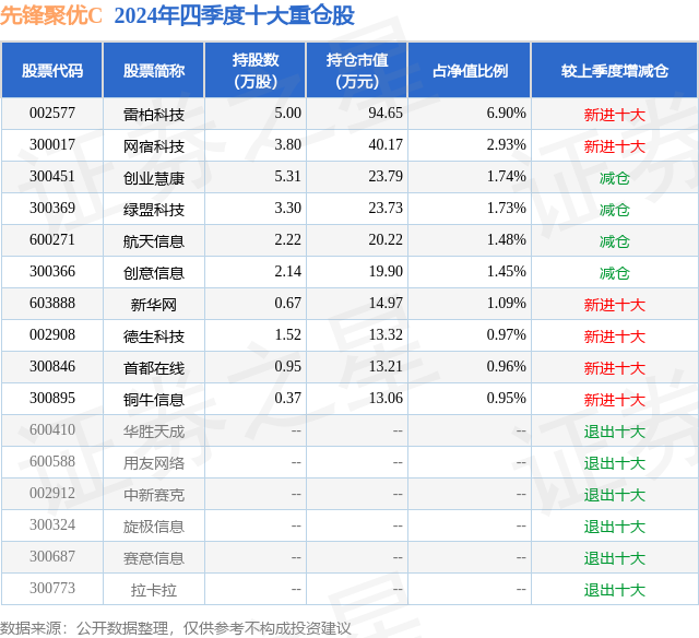 从基金规模来看,先锋聚优C基金2024年四季度公布的基金规模为0.11亿元,较上一期规模649.06万元变化了419.06万元,环比变化了64.56%。该基金最新一期资产配置为:股票占净值比21.19%,无债券类资产,现金占净值比58.49%。从基金持仓来看,该基金当季前十大股票仓位达20.2%,第一大重仓股为雷柏科技(002577),持仓占比为6.9%。