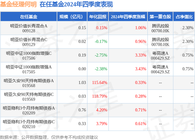 证券之星消息,日前明亚中证1000指数增强C基金公布四季报,2024年四季度最新规模0.19亿元,季度净值涨幅为3.33%。