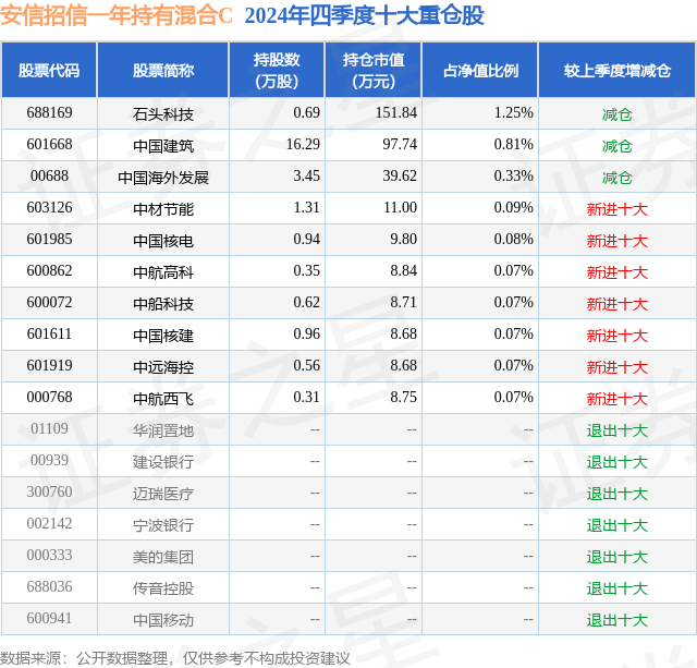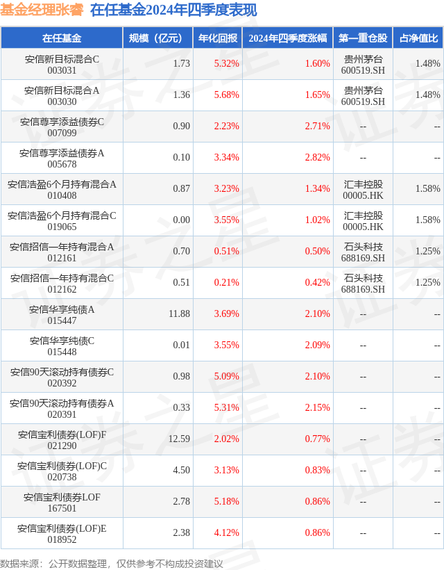 证券之星消息,日前安信招信一年持有混合C基金公布四季报,2024年四季度最新规模0.51亿元,季度净值涨幅为0.42%。