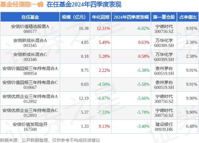 安信价值精选股票A现任基金经理为陈一峰。其中在任基金经理陈一峰已从业10年又278天,2014年4月21日正式接手管理安信价值精选股票A,任职期间累计回报为248.69%。目前还管理着8只基金产品(包括A类和C类),其中本季度表现最佳的基金为安信新成长混合A(003345),季度净值涨幅为0.63%。