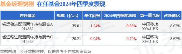 从基金规模来看,睿远稳进配置两年持有混合C基金2024年四季度公布的基金规模为20.21亿元,较上一期规模26.96亿元变化了-6.75亿元,环比变化了-25.05%。该基金最新一期资产配置为:股票占净值比38.94%,债券占净值比82.89%,现金占净值比0.09%。从基金持仓来看,该基金当季前十大股票仓位达26.06%,第一大重仓股为中国移动(00941),持仓占比为8.62%。