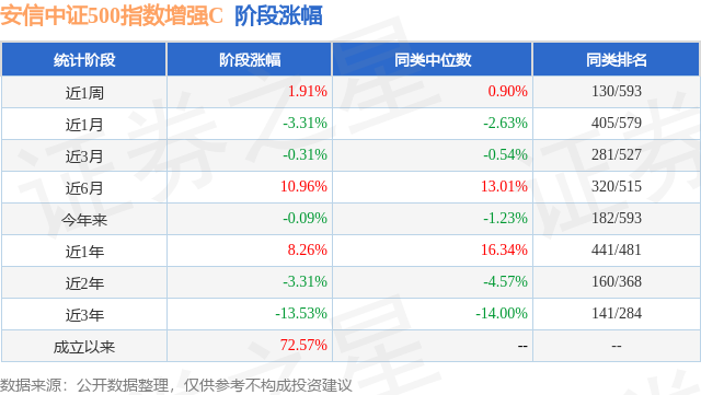 从业绩表现来看,安信中证500指数增强C基金过去一年净值涨幅为8.26%,在同类基金中排名441/481,同类基金过去一年净值涨幅中位数为16.34%。而基金过去一年的最大回撤为-17.57%,成立以来的最大回撤为-33.91%。