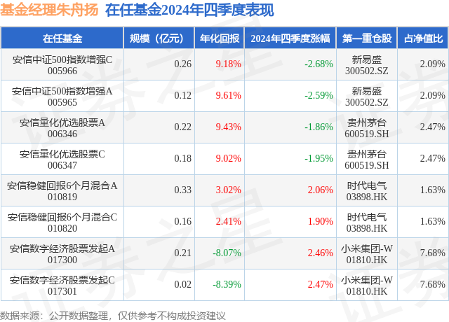 证券之星消息,日前安信中证500指数增强C基金公布四季报,2024年四季度最新规模0.26亿元,季度净值涨幅为-2.68%。