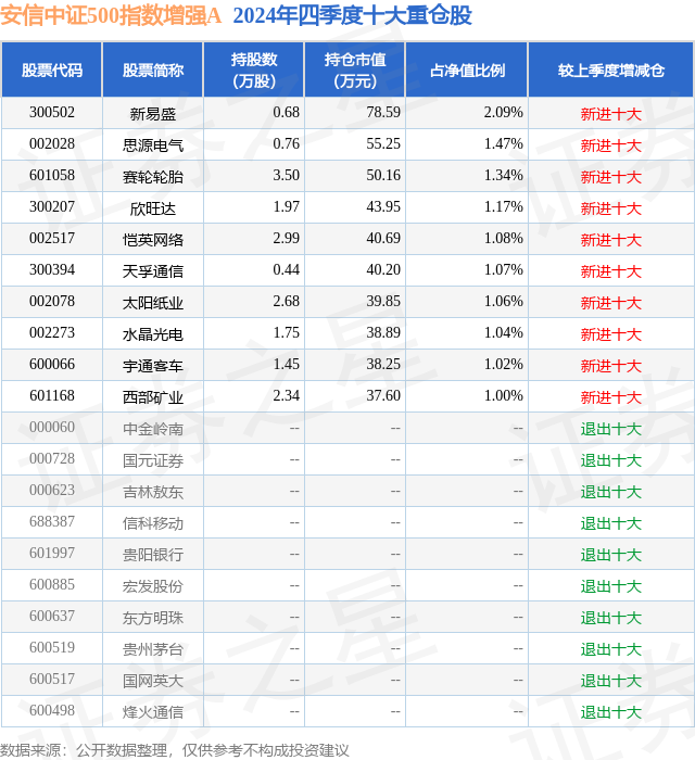 证券之星消息,日前安信中证500指数增强A基金公布四季报,2024年四季度最新规模0.12亿元,季度净值涨幅为-2.59%。