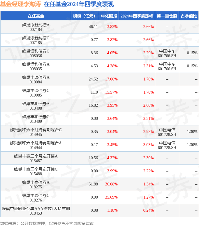 证券之星消息,日前蜂巢恒利债券A基金公布四季报,2024年四季度最新规模4.53亿元,季度净值涨幅为2.31%。