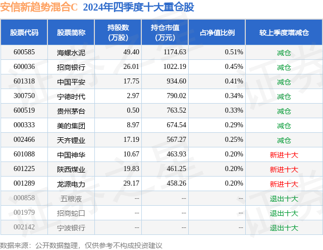 从基金规模来看,安信新趋势混合C基金2024年四季度公布的基金规模为16.46亿元,较上一期规模17.23亿元变化了-7667.96万元,环比变化了-4.45%。该基金最新一期资产配置为:股票占净值比11.55%,债券占净值比73.7%,现金占净值比1.91%。从基金持仓来看,该基金当季前十大股票仓位达3.18%,第一大重仓股为海螺水泥(600585),持仓占比为0.51%。
