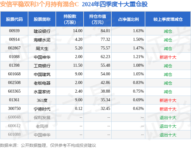 从基金规模来看,安信平稳双利3个月持有混合C基金2024年四季度公布的基金规模为0.11亿元,较上一期规模1783.99万元变化了-717.69万元,环比变化了-40.23%。该基金最新一期资产配置为:股票占净值比19.72%,债券占净值比78.29%,现金占净值比0.6%。从基金持仓来看,该基金当季前十大股票仓位达10.84%,第一大重仓股为建设银行(00939),持仓占比为1.63%。
