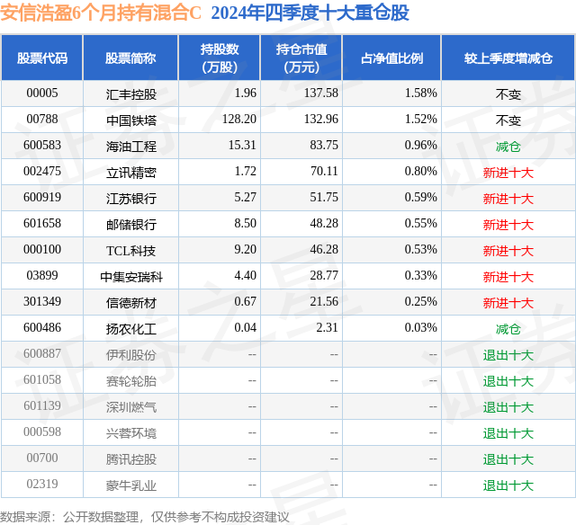 证券之星消息,日前安信浩盈6个月持有混合C基金公布四季报,2024年四季度最新规模0.0亿元,季度净值涨幅为1.02%。