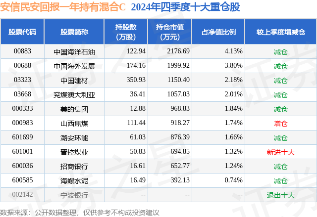 从基金规模来看,安信民安回报一年持有混合C基金2024年四季度公布的基金规模为4.03亿元,较上一期规模5.11亿元变化了-1.08亿元,环比变化了-21.15%。该基金最新一期资产配置为:股票占净值比28.43%,债券占净值比68.13%,现金占净值比1.04%。从基金持仓来看,该基金当季前十大股票仓位达20.66%,第一大重仓股为中国海洋石油(00883),持仓占比为4.13%。