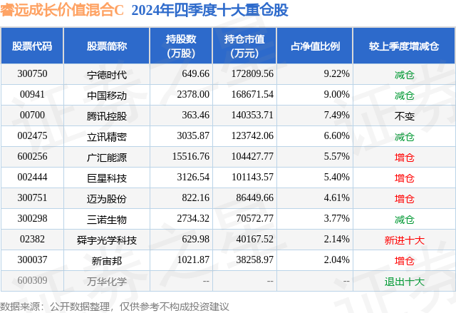 从基金规模来看,睿远成长价值混合C基金2024年四季度公布的基金规模为19.5亿元,较上一期规模21.86亿元变化了-2.36亿元,环比变化了-10.81%。该基金最新一期资产配置为:股票占净值比88.71%,债券占净值比5.77%,现金占净值比0.81%。从基金持仓来看,该基金当季前十大股票仓位达55.84%,第一大重仓股为宁德时代(300750),持仓占比为9.22%。