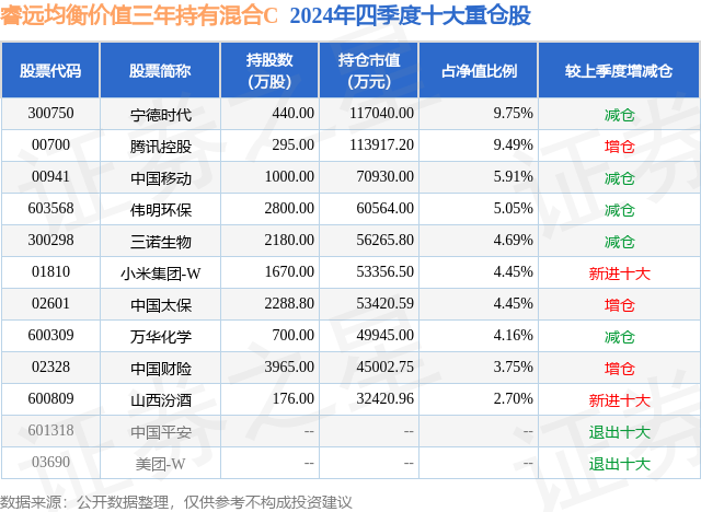 从基金规模来看,睿远均衡价值三年持有混合C基金2024年四季度公布的基金规模为13.43亿元,较上一期规模15.16亿元变化了-1.73亿元,环比变化了-11.44%。该基金最新一期资产配置为:股票占净值比87.78%,债券占净值比6.04%,现金占净值比0.9%。从基金持仓来看,该基金当季前十大股票仓位达54.4%,第一大重仓股为宁德时代(300750),持仓占比为9.75%。