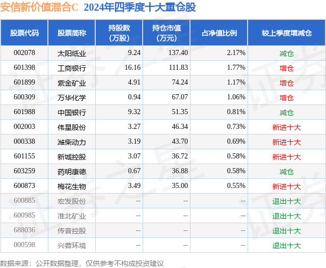 从基金规模来看,安信新价值混合C基金2024年四季度公布的基金规模为0.5亿元,较上一期规模4817.02万元变化了155.61万元,环比变化了3.23%。该基金最新一期资产配置为:股票占净值比15.61%,债券占净值比57.12%,现金占净值比1.7%。从基金持仓来看,该基金当季前十大股票仓位达10.11%,第一大重仓股为太阳纸业(002078),持仓占比为2.17%。