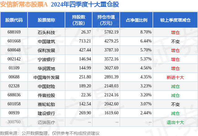证券之星消息,日前安信新常态股票A基金公布四季报,2024年四季度最新规模4.25亿元,季度净值涨幅为-4.88%。