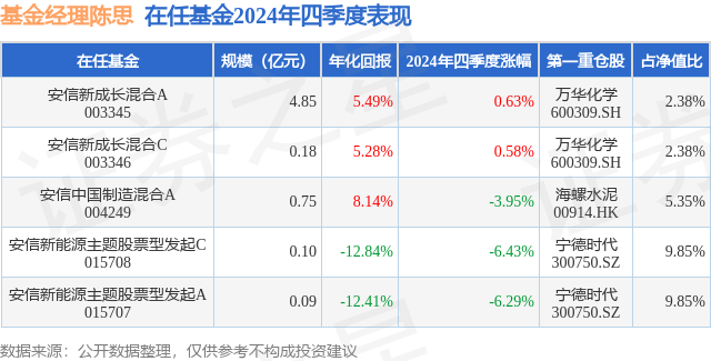 证券之星消息,日前安信新能源主题股票型发起C基金公布四季报,2024年四季度最新规模0.1亿元,季度净值涨幅为-6.43%。