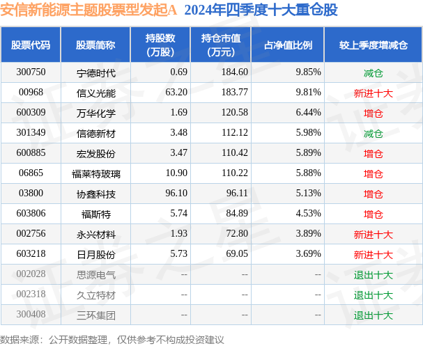 从基金规模来看,安信新能源主题股票型发起A基金2024年四季度公布的基金规模为0.09亿元,较上一期规模975.76万元变化了-53.65万元,环比变化了-5.5%。该基金最新一期资产配置为:股票占净值比93.03%,无债券类资产,现金占净值比7.38%。从基金持仓来看,该基金当季前十大股票仓位达61.09%,第一大重仓股为宁德时代(300750),持仓占比为9.85%。