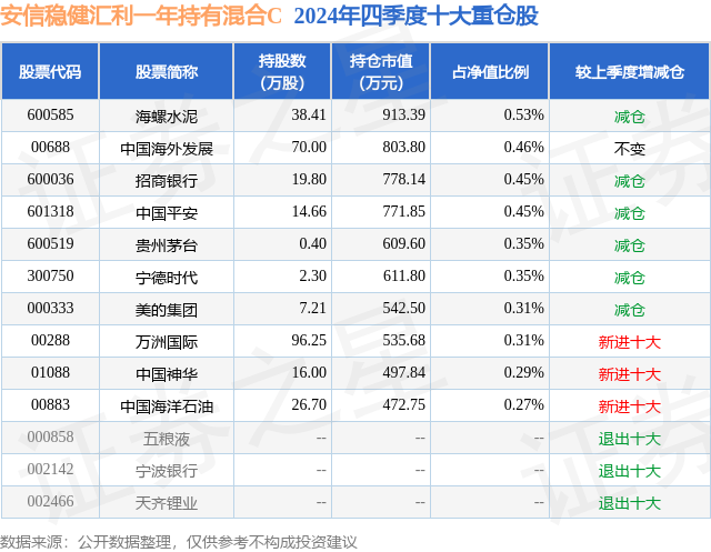 从基金规模来看,安信稳健汇利一年持有混合C基金2024年四季度公布的基金规模为5.38亿元,较上一期规模7.2亿元变化了-1.82亿元,环比变化了-25.26%。该基金最新一期资产配置为:股票占净值比13.25%,债券占净值比91.35%,现金占净值比0.55%。从基金持仓来看,该基金当季前十大股票仓位达3.77%,第一大重仓股为海螺水泥(600585),持仓占比为0.53%。