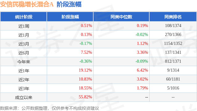 从业绩表现来看,安信民稳增长混合A基金过去一年净值涨幅为19.12%,在同类基金中排名9/1314,同类基金过去一年净值涨幅中位数为6.42%。而基金过去一年的最大回撤为-13.17%,成立以来的最大回撤为-13.17%。