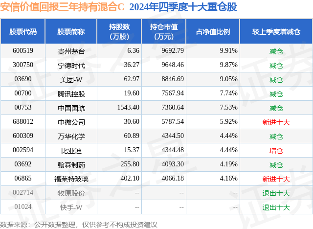 从基金规模来看,安信价值回报三年持有混合C基金2024年四季度公布的基金规模为0.03亿元,较上一期规模270.46万元变化了-11.29万元,环比变化了-4.17%。该基金最新一期资产配置为:股票占净值比92.84%,债券占净值比5.49%,现金占净值比1.9%。从基金持仓来看,该基金当季前十大股票仓位达67.25%,第一大重仓股为贵州茅台(600519),持仓占比为9.91%。