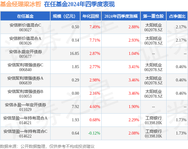 证券之星消息,日前安信楚盈一年持有混合A基金公布四季报,2024年四季度最新规模1.93亿元,季度净值涨幅为2.29%。