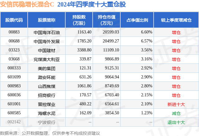 从基金规模来看,安信民稳增长混合C基金2024年四季度公布的基金规模为8.27亿元,较上一期规模7.52亿元变化了7495.41万元,环比变化了9.96%。该基金最新一期资产配置为:股票占净值比47.2%,债券占净值比27.7%,现金占净值比3.59%。从基金持仓来看,该基金当季前十大股票仓位达33.99%,第一大重仓股为中国海洋石油(00883),持仓占比为6.6%。