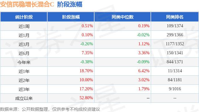 从业绩表现来看,安信民稳增长混合C基金过去一年净值涨幅为18.7%,在同类基金中排名11/1314,同类基金过去一年净值涨幅中位数为6.42%。而基金过去一年的最大回撤为-13.28%,成立以来的最大回撤为-13.28%。