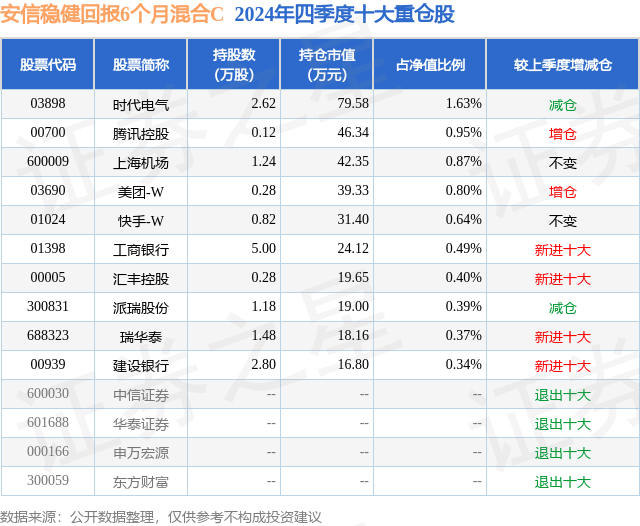 证券之星消息,日前安信稳健回报6个月混合C基金公布四季报,2024年四季度最新规模0.16亿元,季度净值涨幅为1.9%。