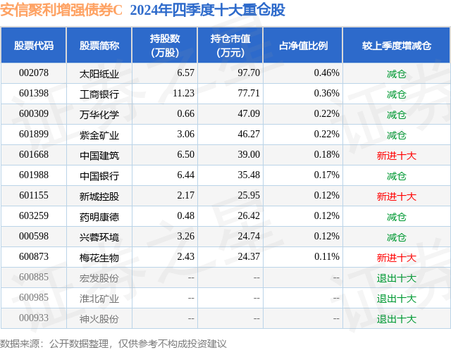 从基金规模来看,安信聚利增强债券C基金2024年四季度公布的基金规模为1.85亿元,较上一期规模4234.39万元变化了1.43亿元,环比变化了337.54%。该基金最新一期资产配置为:股票占净值比3.25%,债券占净值比19.24%,现金占净值比42.15%。从基金持仓来看,该基金当季前十大股票仓位达2.08%,第一大重仓股为太阳纸业(002078),持仓占比为0.46%。